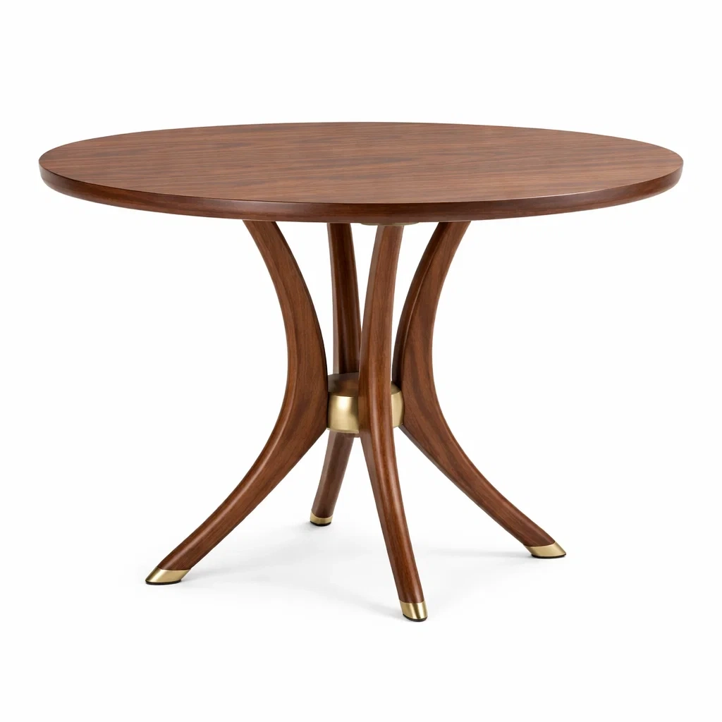 Table de salle à manger ronde en bois de noyer et métal doré