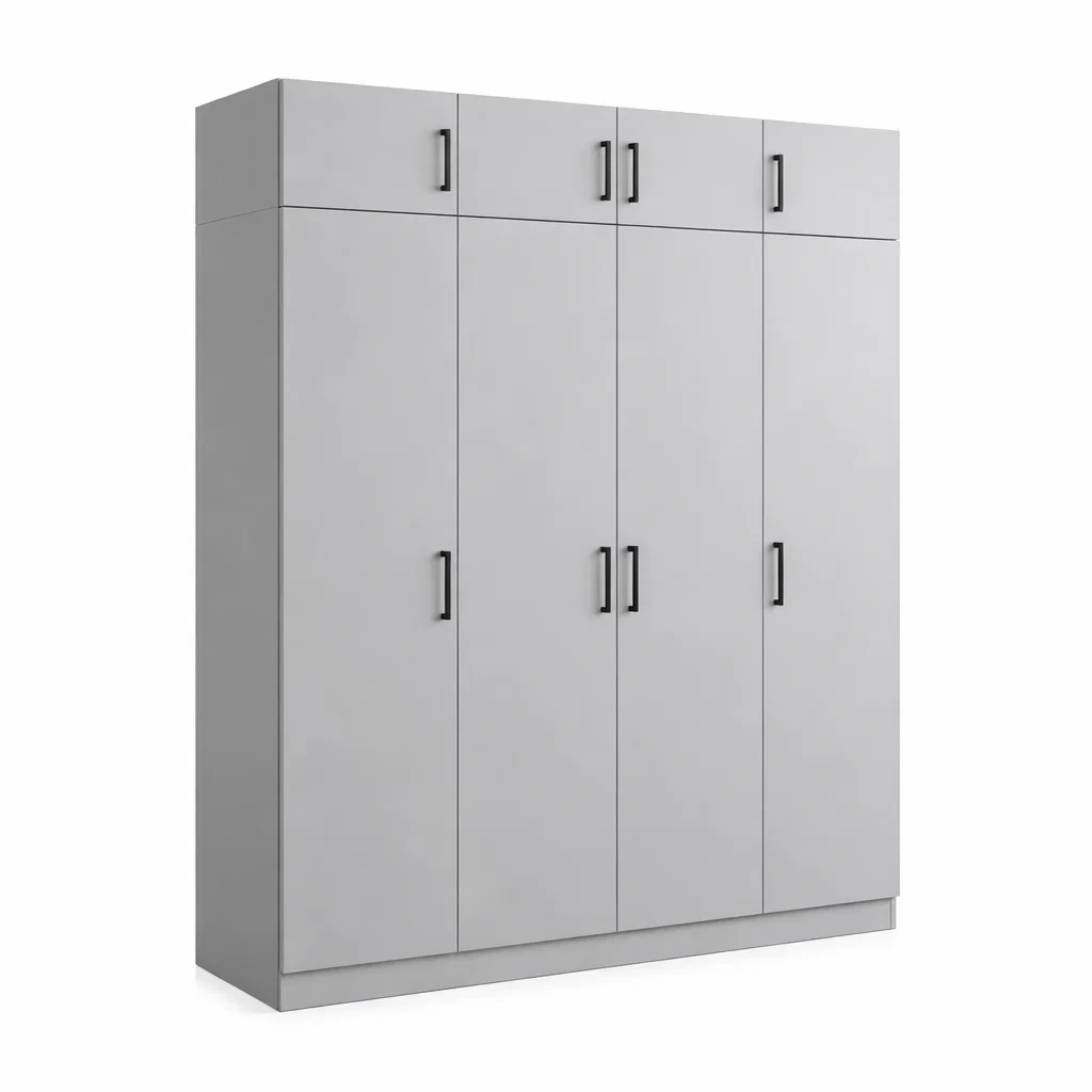 Armoire avec huit portes et poignées en métal noir.