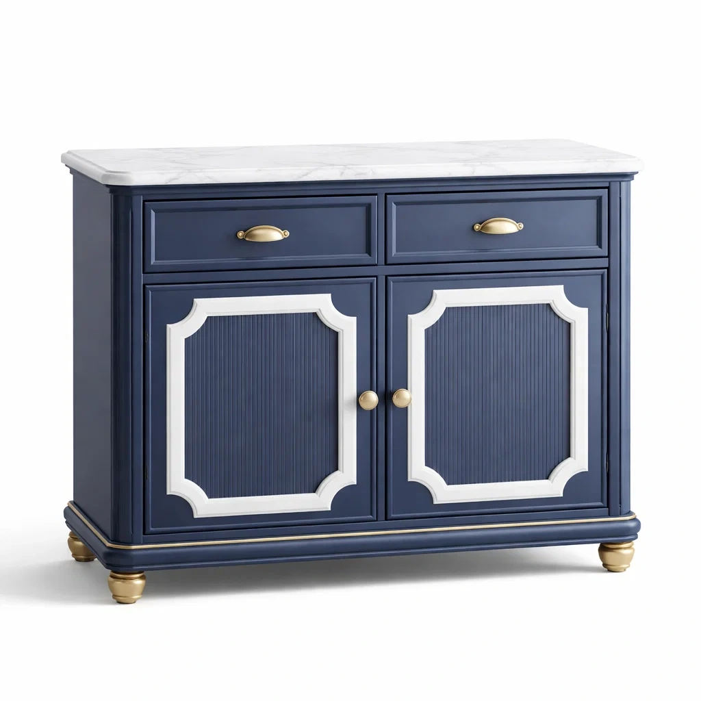 Ce buffet est fabriqué en bois avec des finitions en métal doré. Le plateau est en marbre blanc, offrant un style fonctionnel. Équipé de deux tiroirs et deux portes, il fournit de l'espace pour le stockage.