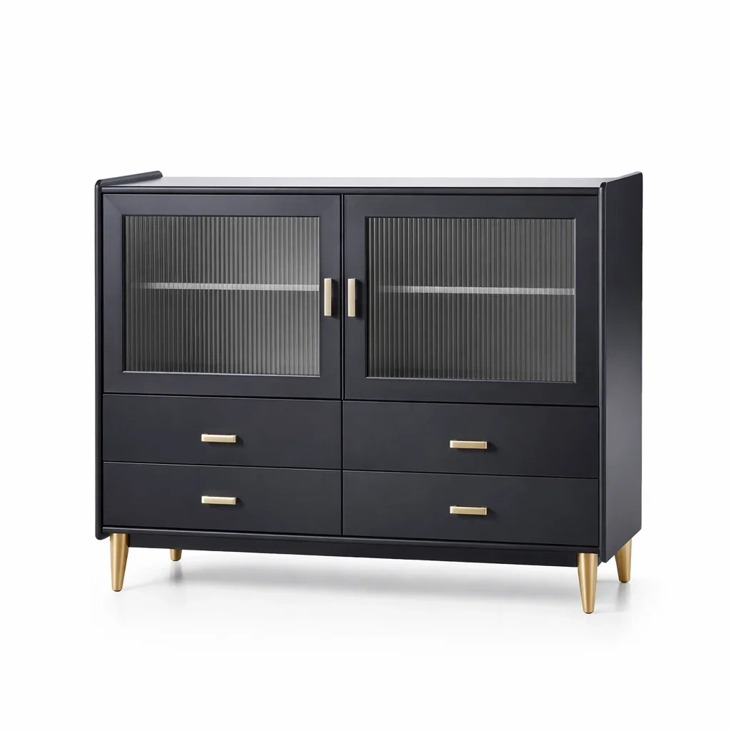 Matériau: Structure en bois, portes en verre strié, poignées et pieds en métal doré.