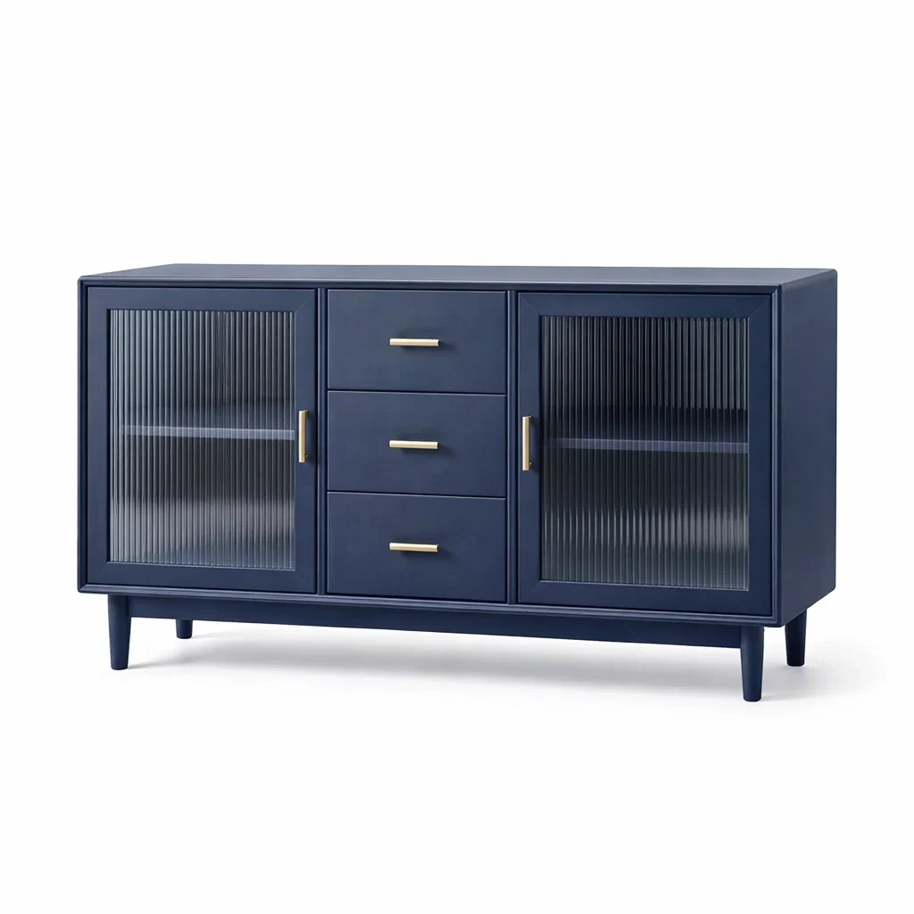 Buffet rectangulaire en MDF avec finition bleue et pieds en bois.