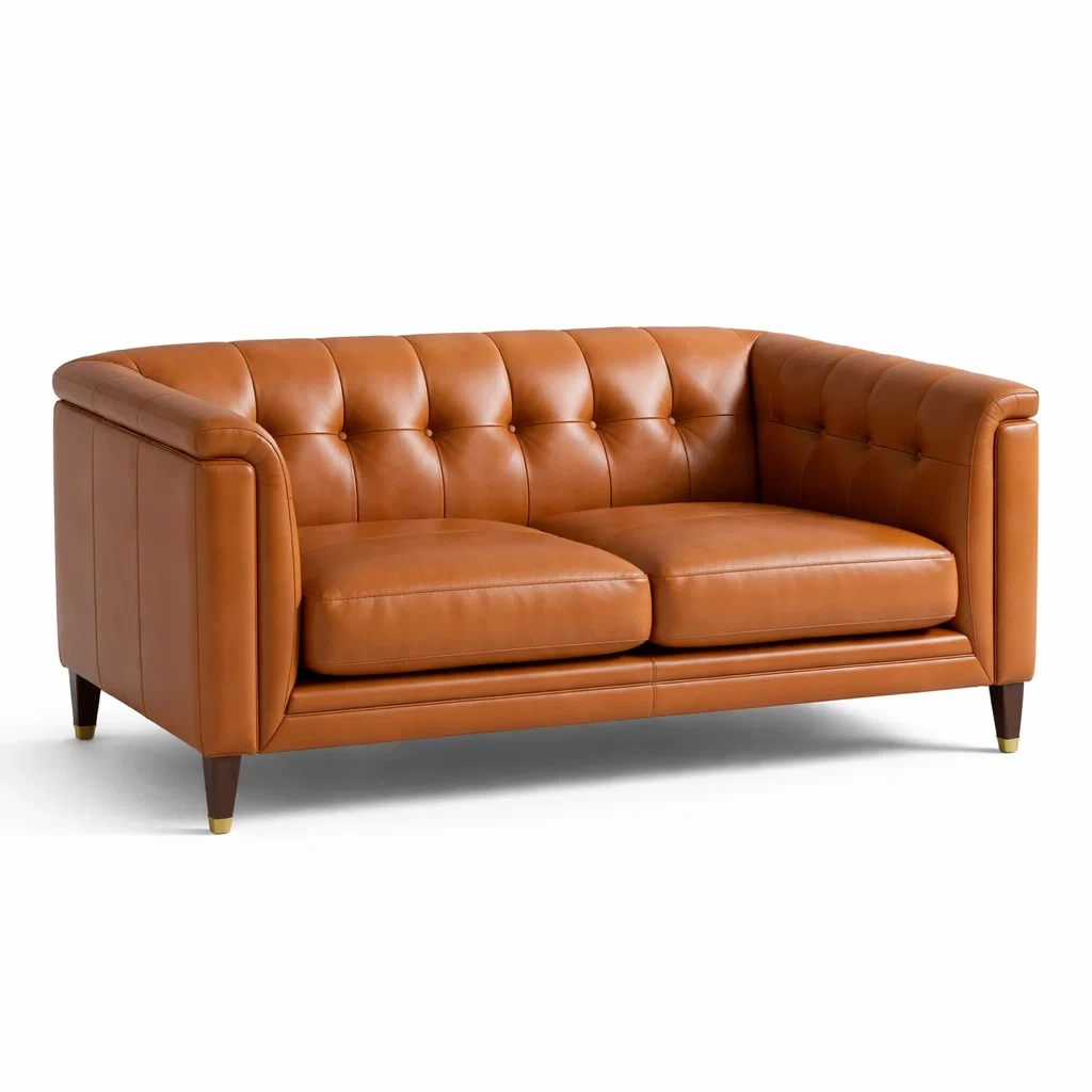 Ce canapé 2 places est revêtu de cuir pleine fleur. Sa structure est en bois massif, assurant solidité et durabilité. Les pieds sont également en bois, offrant un bon maintien.