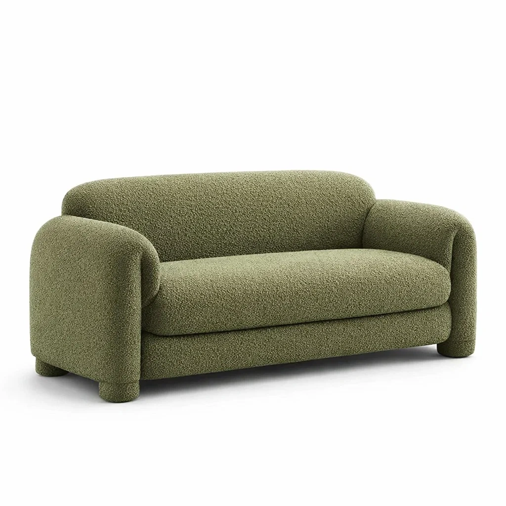 Ce canapé 3 places possède une structure en bois massif, offrant stabilité et durabilité. Le revêtement est en tissu bouclé polyester doux. Les dimensions totales sont de 200 cm de long, 95 cm de profondeur et 75 cm de hauteur. Les coussins sont rembourrés avec de la mousse haute densité pour un soutien optimal.