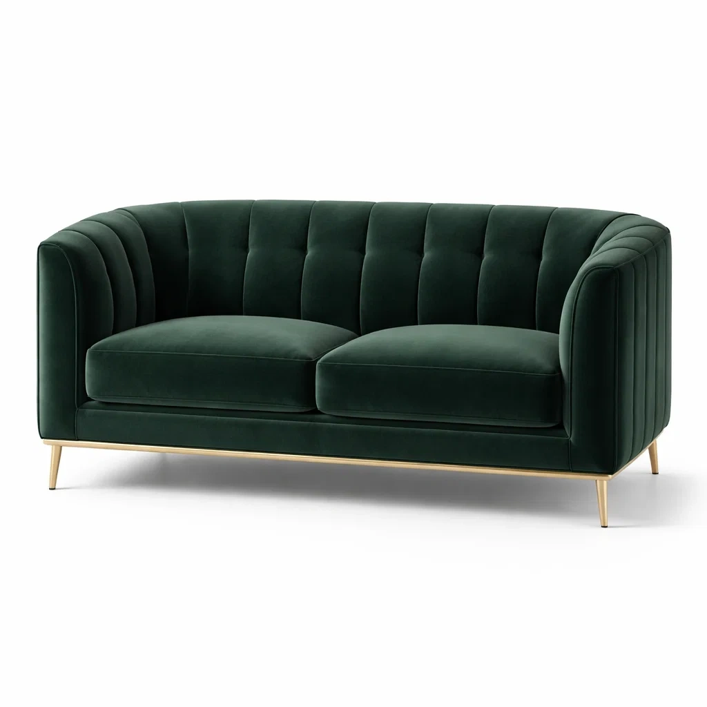 Ce canapé est tapissé de velours avec un rembourrage en mousse de polyuréthane pour le confort. La structure est soutenue par des pieds en acier inoxydable. Convient pour un usage intérieur.