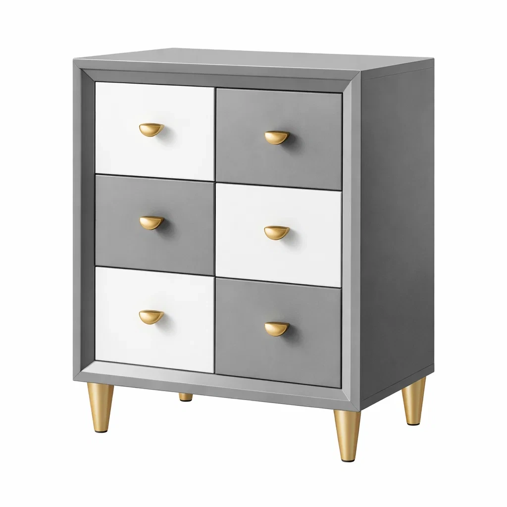 Commode en bois et métal gris et blanc avec poignées dorées et 6 tiroirs
