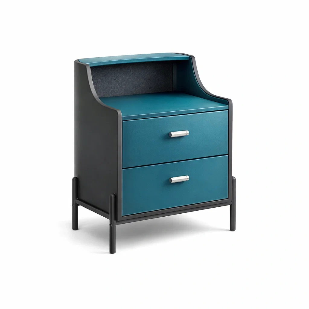 Table de chevet en bois mdf et métal avec 2 tiroirs bleu et noir