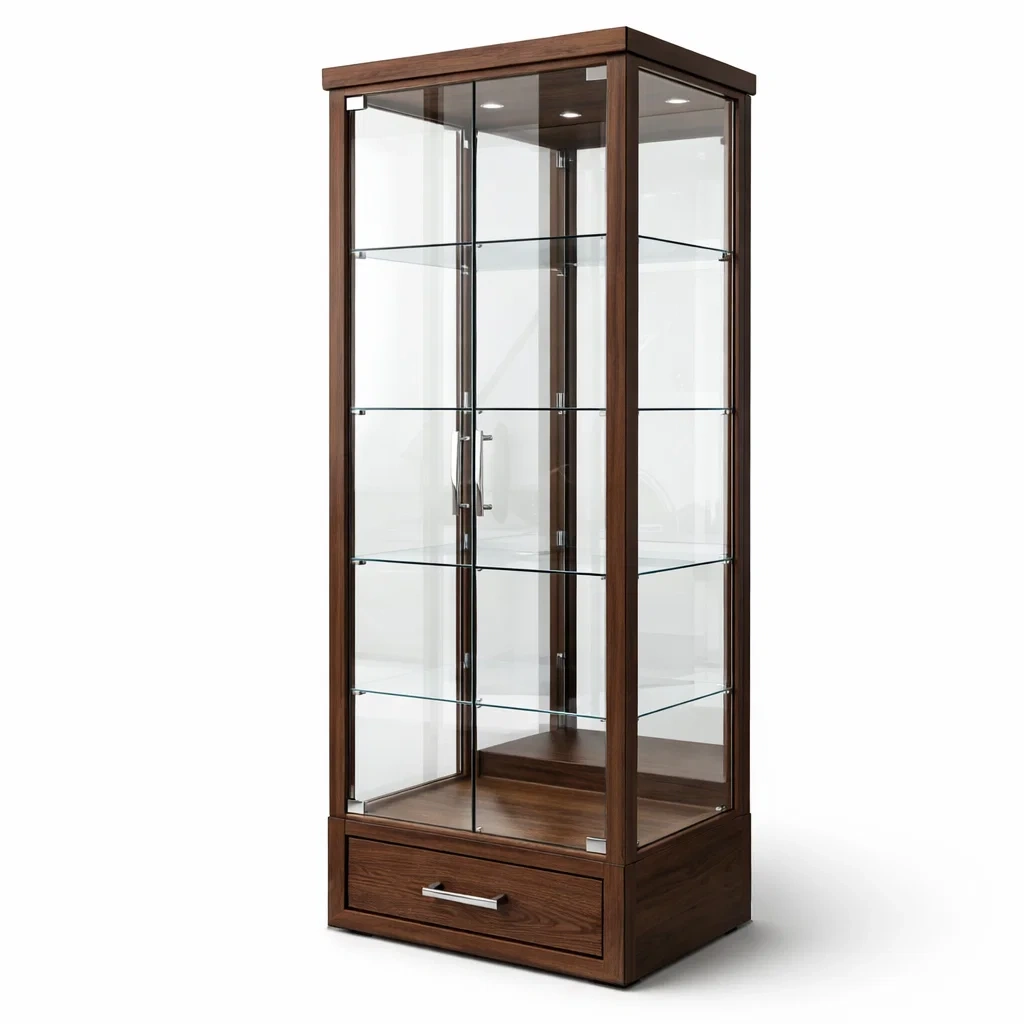 Vitrine avec cadre en bois de noyer et étagères en verre trempé de 6 mm d'épaisseur. Dimensions de 180 cm de hauteur, 80 cm de largeur et 40 cm de profondeur.