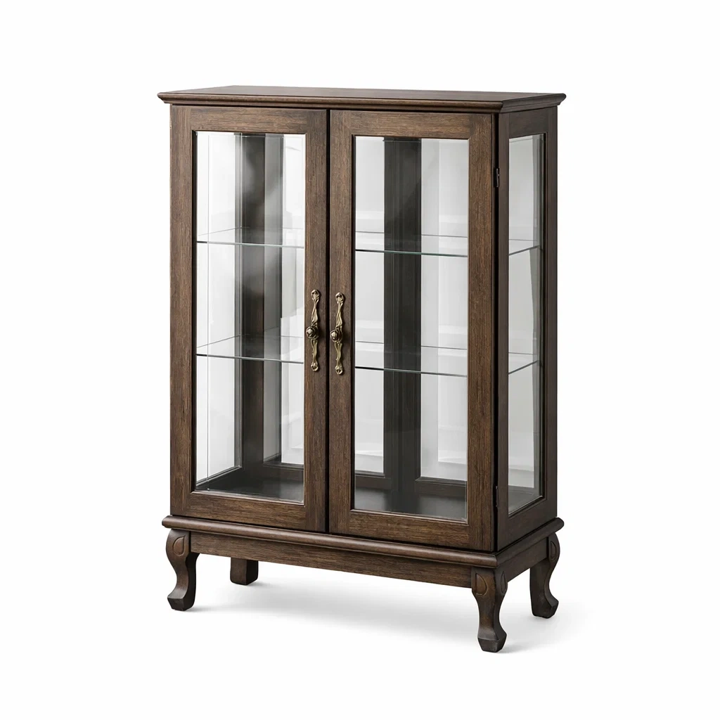 Vitrine avec structure en bois massif et portes vitrées en verre trempé. Dimensions : hauteur 120 cm, largeur 80 cm, profondeur 40 cm.